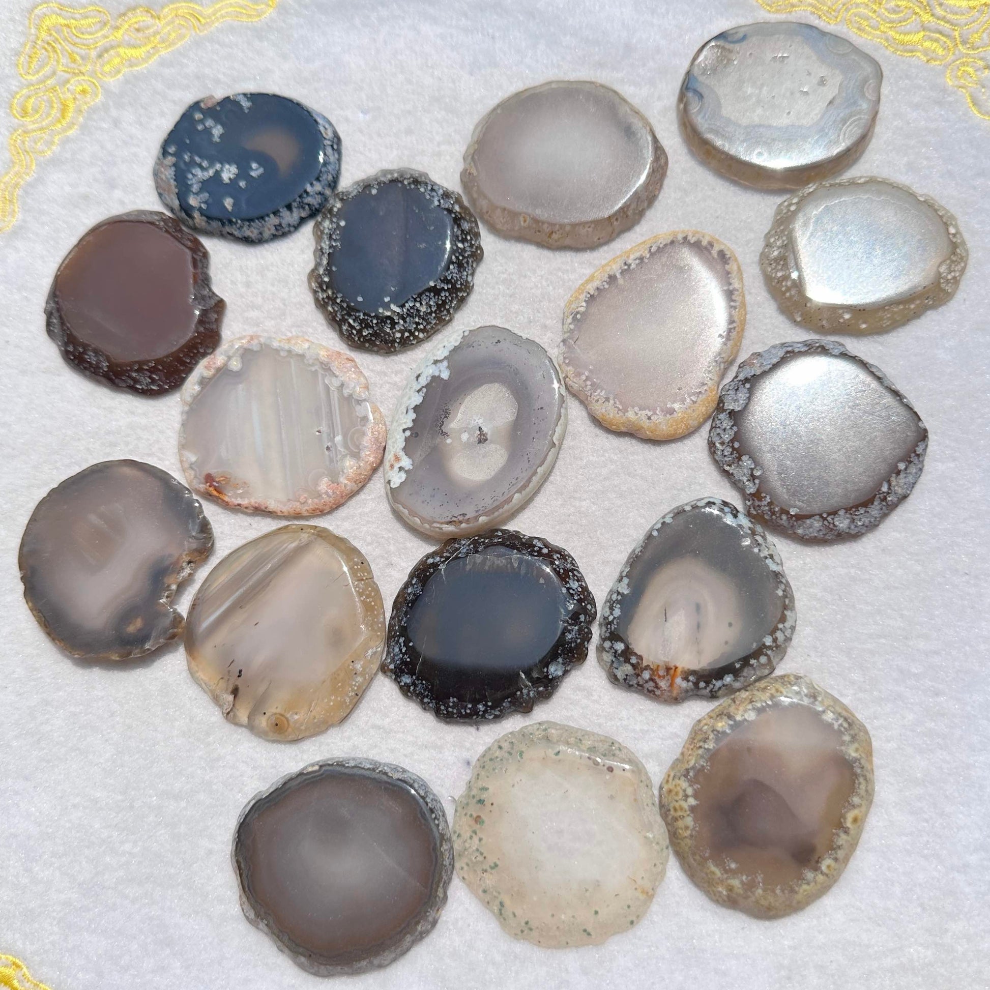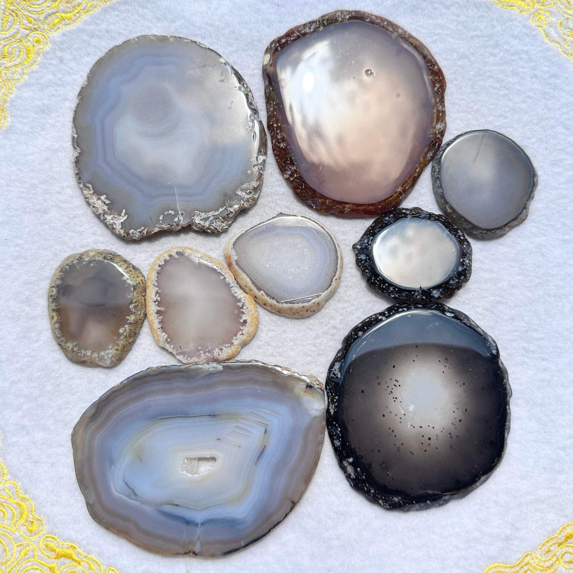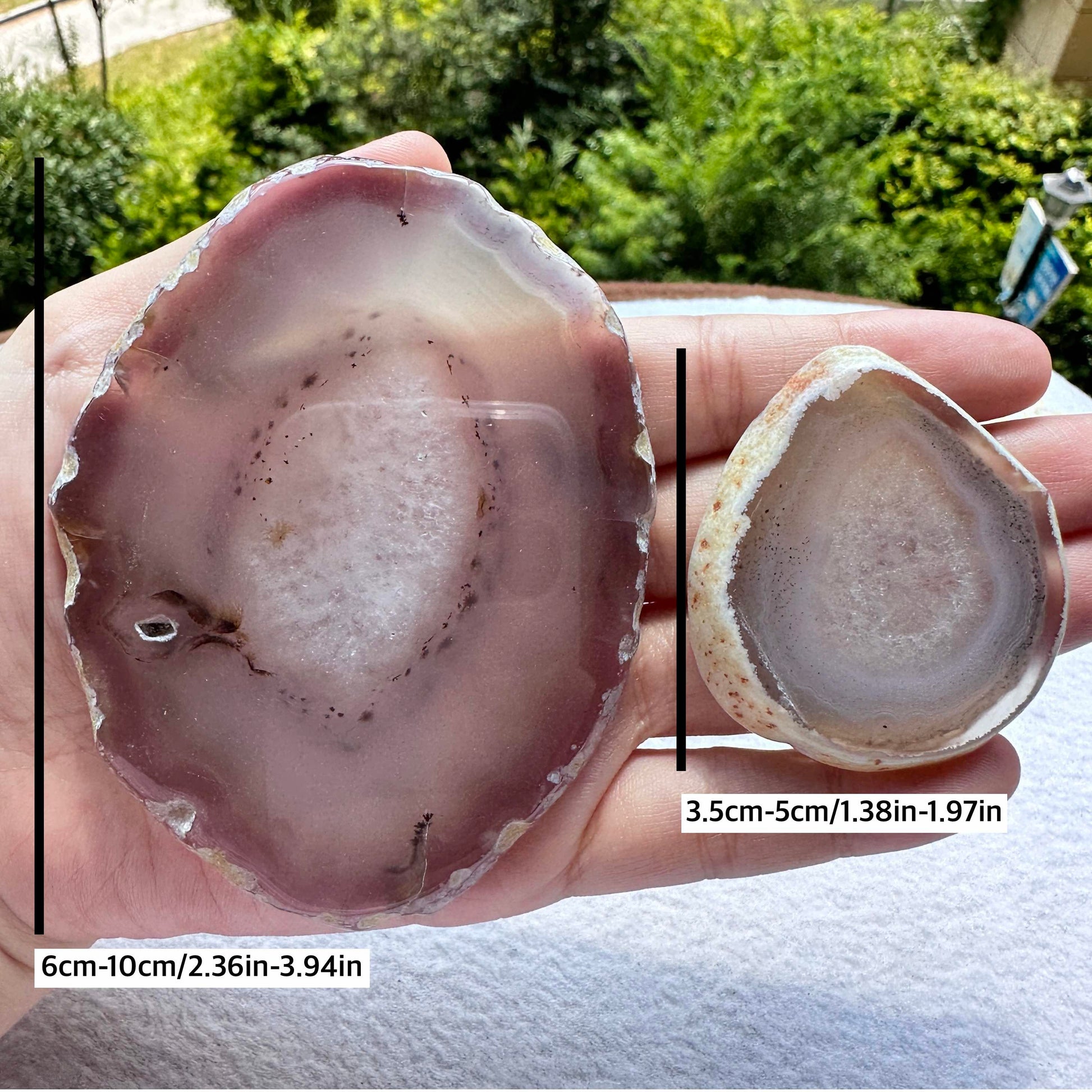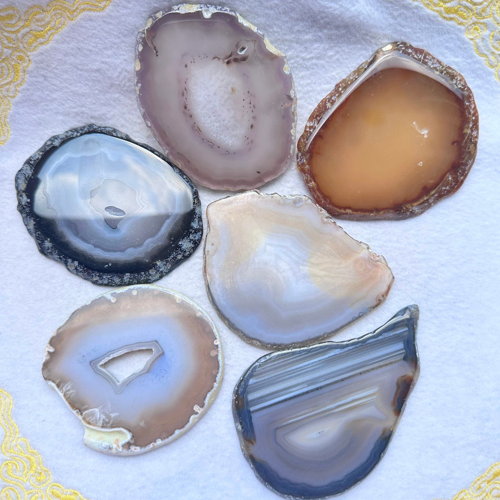 - Please note that as these agate slices are made from natural stones, variations in color, size, and pattern are expected. Each slice is unique and may have slight imperfections such as dents or cracks, which add to their charm.