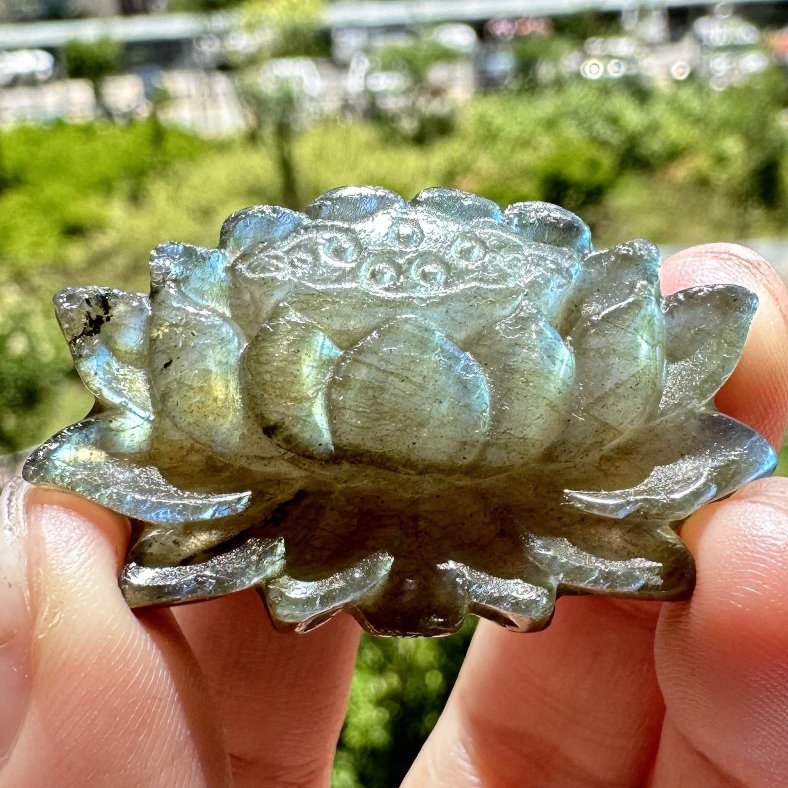 Natural Labradorite Lotus Carvings with Glow, Labradorite Flower Sculptures, Lotus Carving, Flower Carving